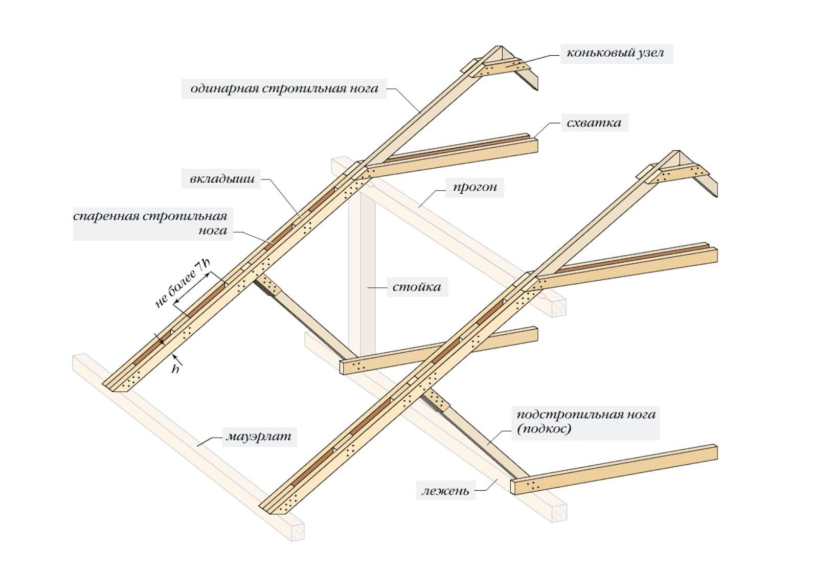 Соединение ригеля со стропилами двускатной или ломаной крыши испытывает наиболее сильные нагрузки зимой, когда на кровле лежит снег. Сделать его максимально прочным поможет простая инструкция: ригель соединяется со стропилом внакладку и крепится к нему парой болтов с гайками и широкими шляпками через предварительно просверленные отверстия.