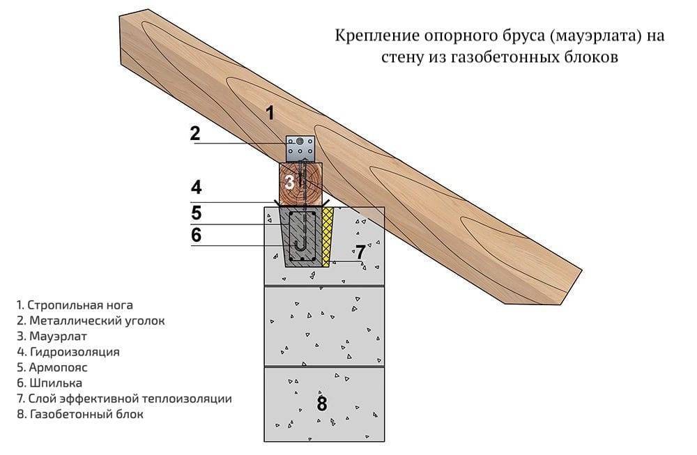 Для крепления мауэрлата обычно используются анкерные шпильки, установленные при заливке армопояса по периметру стены. Под них в брусе сверлятся отверстия, а после укладки брус притягивается к армопоясу гайками с широкими шайбами.