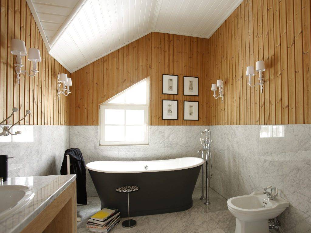 Вагонкой целесообразно отделывать как стены, так и потолок. Также ей можно закрыть ванную, создав защитный экран.