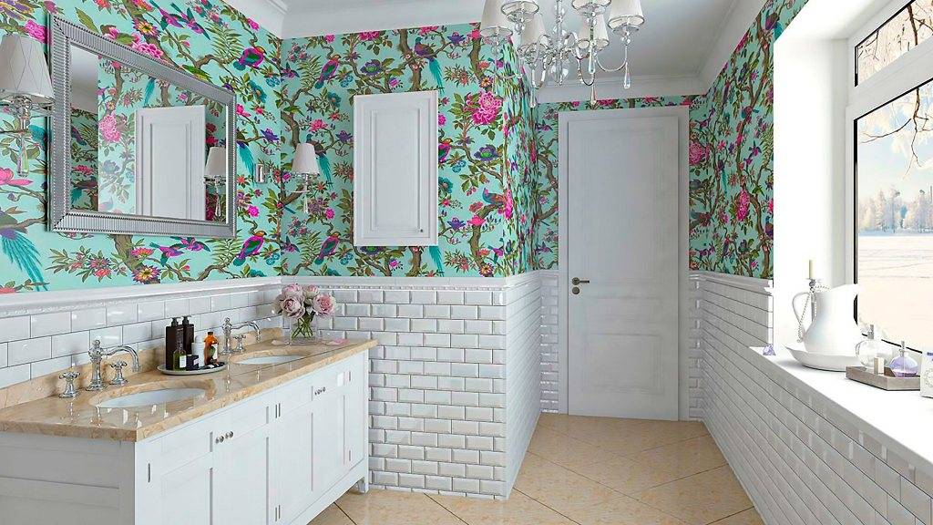 Ещё один способ сберечь семейный бюджет – использовать вместо кафеля влагостойкие обои, минуя мокрые зоны. Этот материал позволяет сделать санузел более “жилым” и уютным, отлично подходит для воссоздания классического стиля, а также кантри и контемпорари. В любом случае, красивые обои придадут помещению характера и удивят гостей.