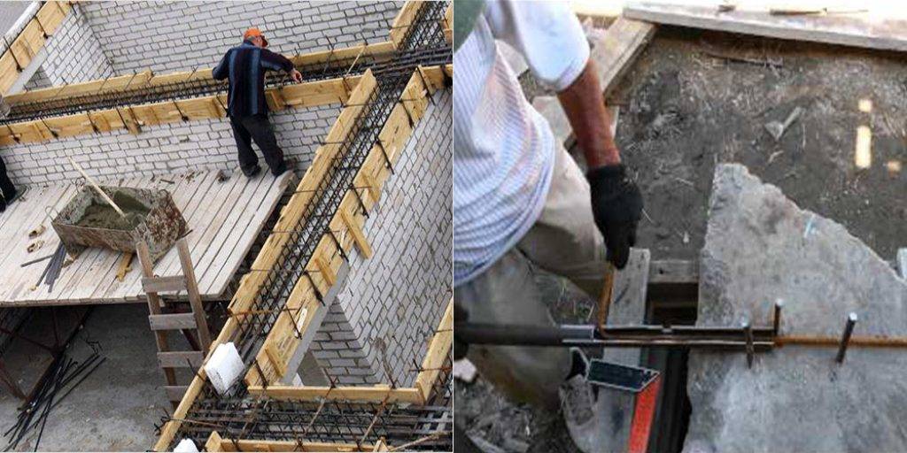 - Отверстия в железобетонном поясе либо кирпичной кладке проделываются при помощи перфоратора, просверлив предварительно доску обычным сверлом. Затем необходимо разложить на дом следующий ряд досок, прибив их к первому ряду при помощи простых 100 мм гвоздей.