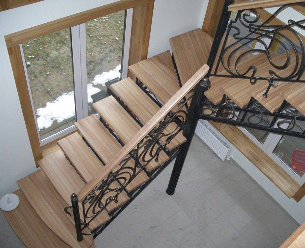 Совет! Перила для такой лестницы делают изящные металлические, поручни – из любого практичного материала, например, древесины или пластика.