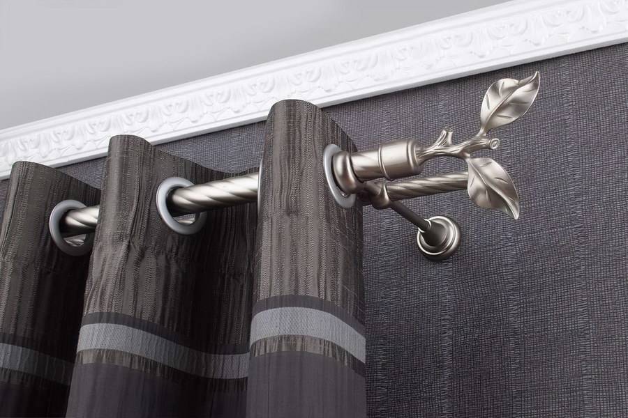 Эффектно и благородно выглядят металлические карнизы, основанием которых может выступать штанга или струна. Конструкция фиксируется к потолку с помощью специальных кронштейнов, в которые вставляется стержень