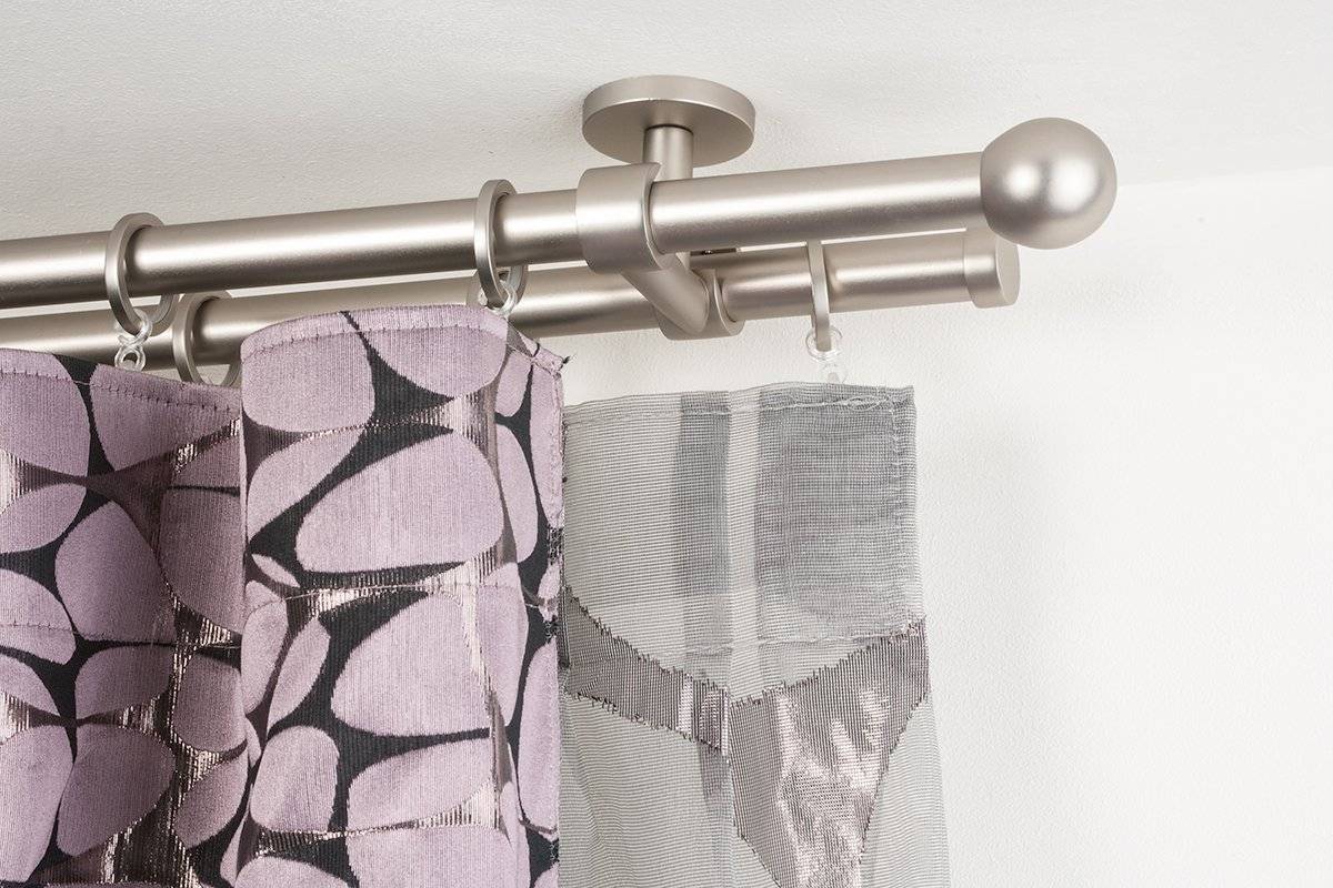 В потолочном варианте чаще всего монтируется один стержень. Однако существуют модели с двумя штангами, которые крепятся на одном кронштейне. Встречаются изделия, на которых могут располагаться раздвижные и подъемные шторы. Выпускаются штанговые металлические потолочные карнизы размером 1,5-4 м. Существуют телескопические варианты, которые трансформируются из изделия длиной 1 м в конструкцию 2,2 м.
