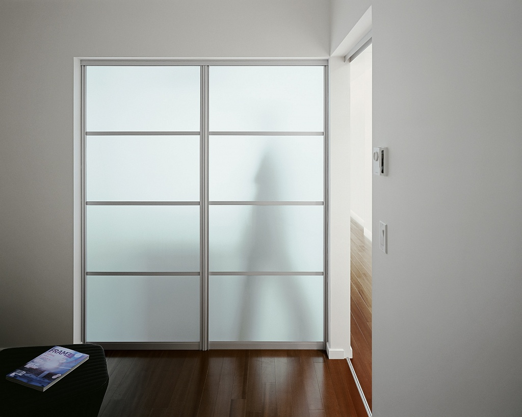 Если раздвижная дверь изготовлена из стекла, то само полотно зажимают с помощью специальных металлических лап.