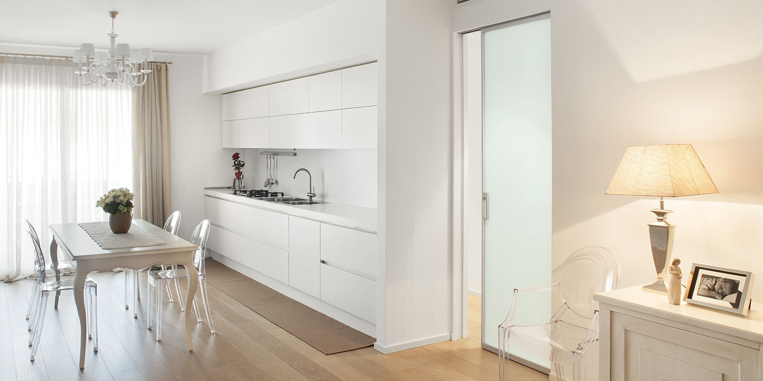 Товары относятся к числу штучных изделий, которые производятся преимущественно на заказ. Механизмы, ролики и полозья при таком решении спрятаны внутри простенка, который, как правило, выполняется специально под створки, по техническому заданию от производителя дверей.