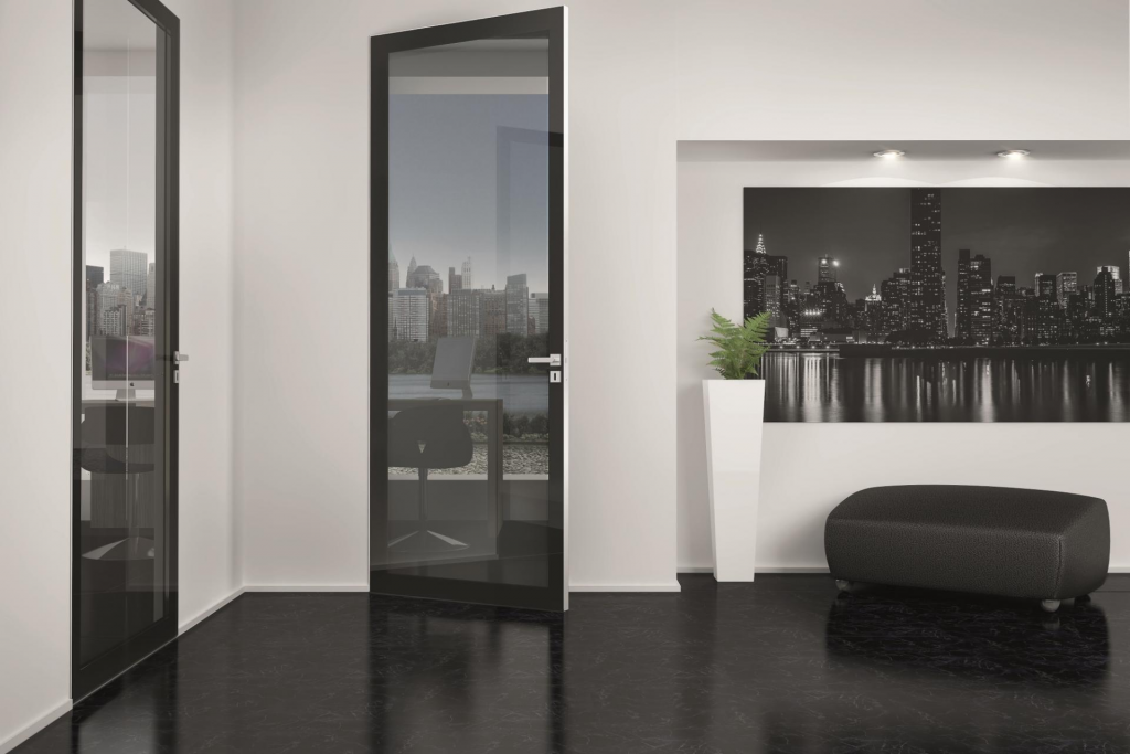 В случае использования цельностеклянных дверей, производитель нередко прибегает к устройству тонировочной плёнки чёрного или коричневого цвета.