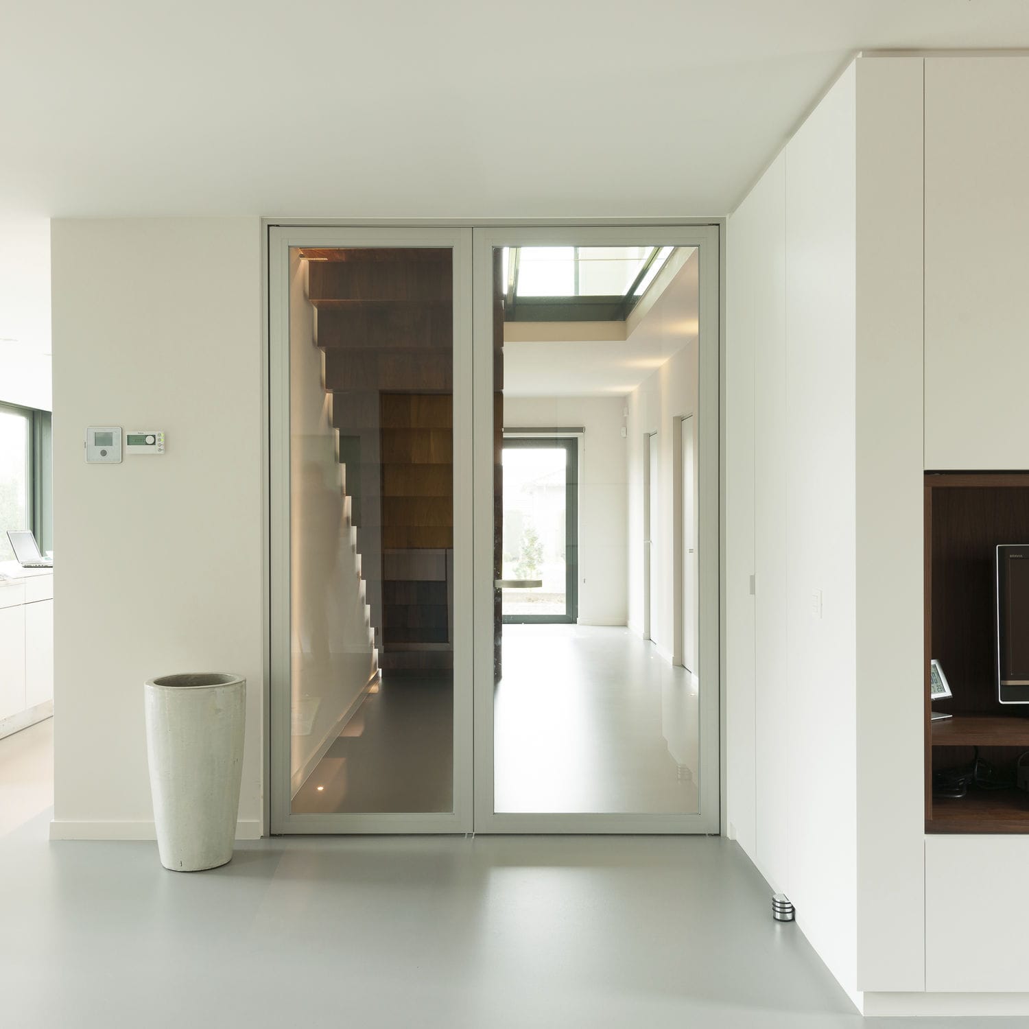 - Конструкция двери и технология её эксплуатации не требуют устройства простенка большой толщины, так как дверь открывается и встаёт рядом с ним. Для использования изделия достаточно тонкой перегородки, обладающей достаточной несущей способностью. Нередко, такие конструкции выполняются из закалённого стекла.