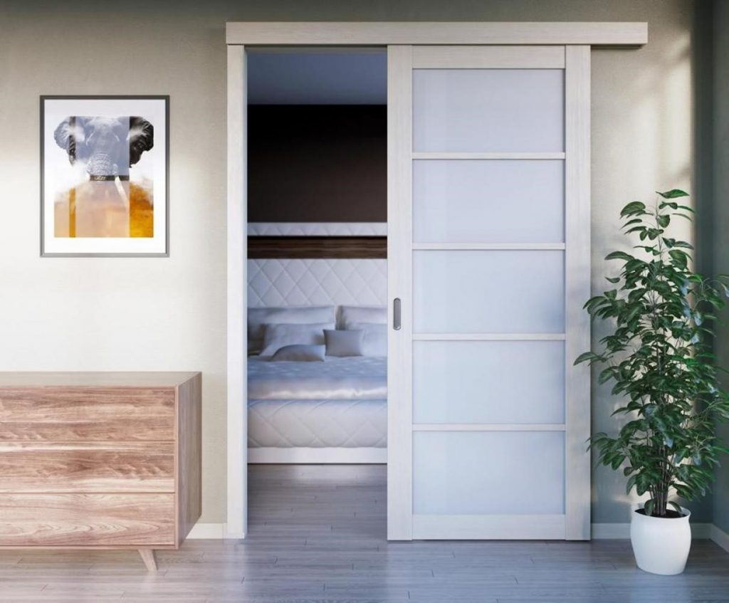 Наиболее распространённый тип раздвижных дверных полотен. Конструкция устроена таким образом, что деревянное, полусинтетическое ламинированное, металлическое, пластиковое или стеклянное полотно плавно скользит вдоль направляющих. Принцип работы таких дверей:
