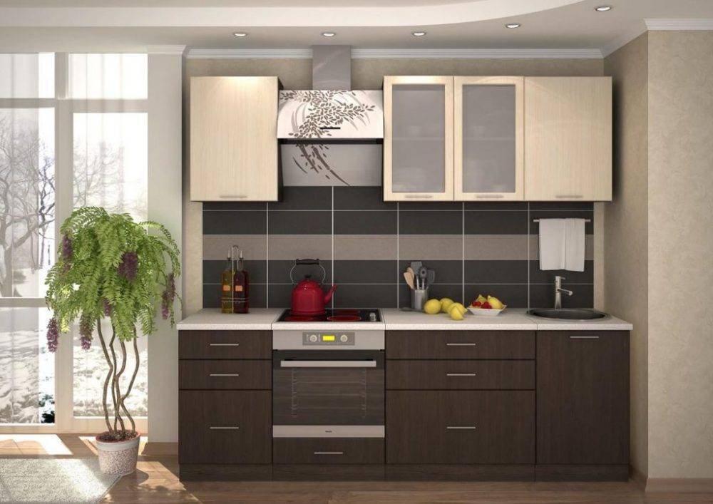 Многие потребители в качестве главного плюса отмечают низкую цену. Линейная вариация гармонично смотрится в прямоугольном помещении. Тумбу и рабочую поверхность устанавливают между раковиной и плитой. Посуду можно хранить в подвесных шкафах и напольной тумбе.