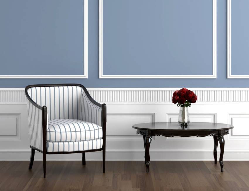Настенные молдинги подходят как дополнительные дизайнерские элементы, фокусирующие внимание на ровных стенах. Окрашиваются планки в оттенки, которые близки к расцветке дизайна всей комнаты