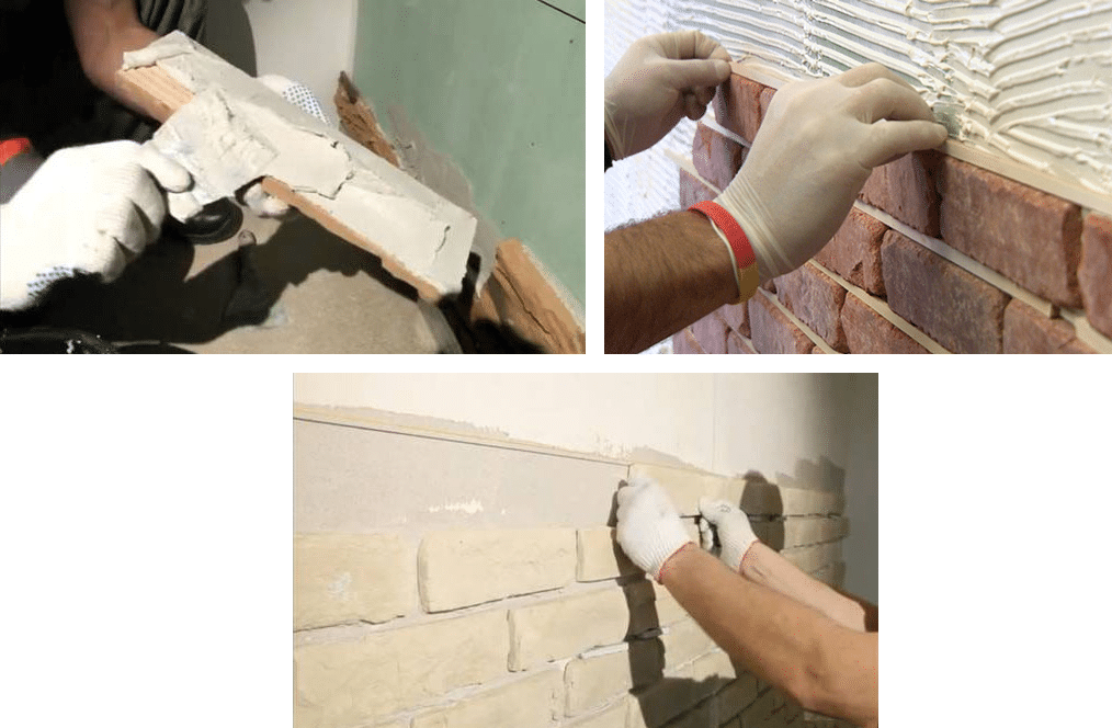 Первоначально наклейте плитку в углах, потом обложите плиткой оконные и дверные проемы, и только после этого приступайте к кладке искусственного камня на основной поверхности. Для того, чтобы суметь выдержать одинаковую толщину швов, нарежьте из дерева или фанеры полоски с шириной равной ширине шва. Для этого удобно использовать гипсокартон, толщина которого 10-12 мм.