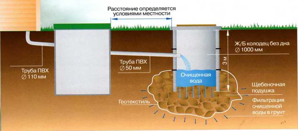 Этот вариант уже представляет собой инженерное сооружение, где стоки проходят настоящую очистку и затем дренируются в почву. Уровень очистки (осветления) сточных вод составляет до 80%.