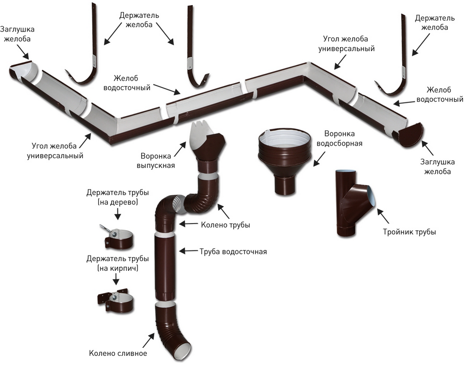 Водоотводные конструкции вне зависимости от типа сырья, используемого для их производства, в базовой комплектации содержат стандартный набор элементов. На крыше обустраиваются желоба, фиксация которых к основанию происходит при помощи специальных крепежных деталей и кронштейнов.