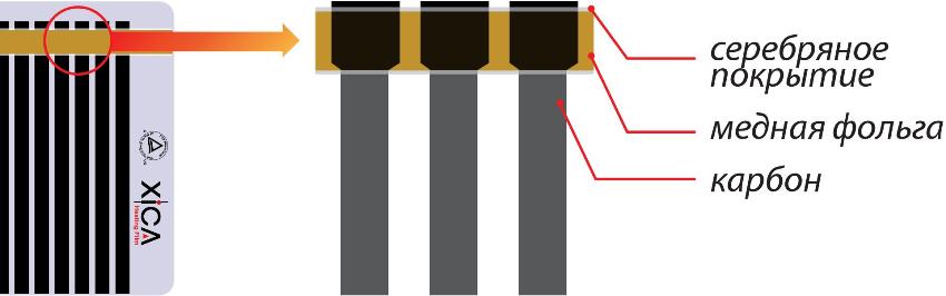 Плёночный тип инфракрасного тёплого пола — это конструкция, в которой карбоновая паста запаяна в полиэтилен. Участки нагревательных элементов соединены медными шинами, впаянными в общую схему. Принцип действия простой: при подключении к электросети карбон выделяет тепло.
