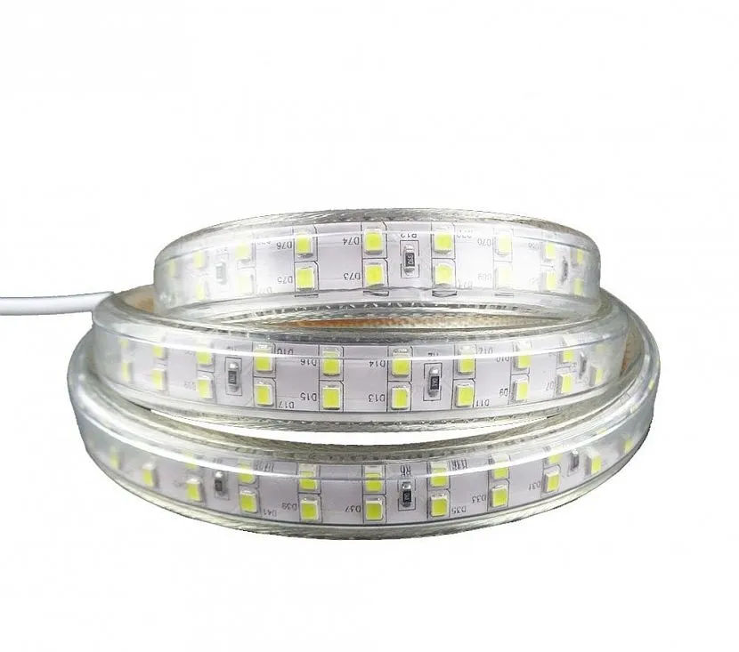 У led-лент с 60 кристаллами на 0,5 метра диоды располагаются в 2 ряда. При этом если посчитать, то получается, что на стандартном 5-сантиметровом участке располагается 6 кристаллов с крайне высокой светимостью. Кроме того, такая светодиодная лента на 220В без блока питания используется для оформления объектов, располагающихся вне ограждающих конструкций – под открытым небом.