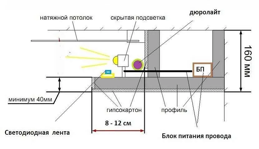 Установку ленточной подсветки в гипсокартонный выступ следует выполнять таким образом: