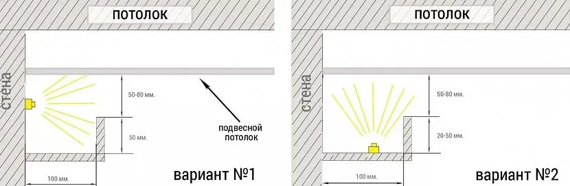 При монтаже подсветки в потолочный плинтус применяется один из двух представленных вариантов размещения светодиодной лентыИсточник sdelaipotolok.com