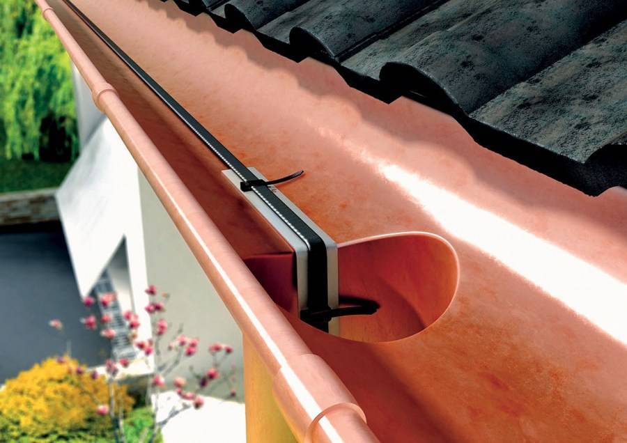Установку греющего кабеля производят после монтажа водостока для крыши. Его просто укладывают внутрь желобов (вдоль) и опускают внутрь трубных стояков. В лотках его крепят специальными зажимами, изготовленными или из нержавейки, или из оцинковки, или из пластика.
