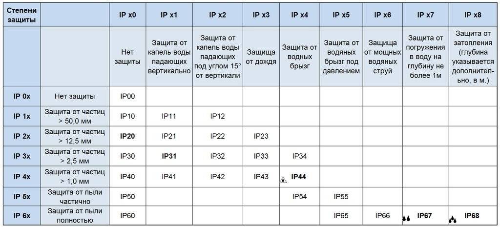 Маркировка состоит из букв IP и двух цифр, первая из которых указывает уровень защищенности изделия от проникновения внутрь его корпуса твердых предметов, а вторая – от воздействия жидкости.