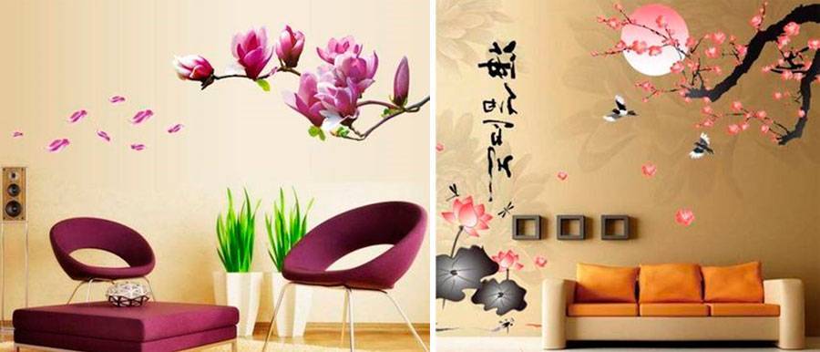 Тематический декор наклейки на стены тоже должен соответствовать теме оформления комнаты. Согласитесь, большой рисунок, на котором изображен японский сад, плохо будет смотреться в обычном среднестатистическом дизайне. Здесь вообще будет неуместна какая-либо большая яркая цветная картинка. Поэтому к выбору стикера нужно относиться очень ответственно.