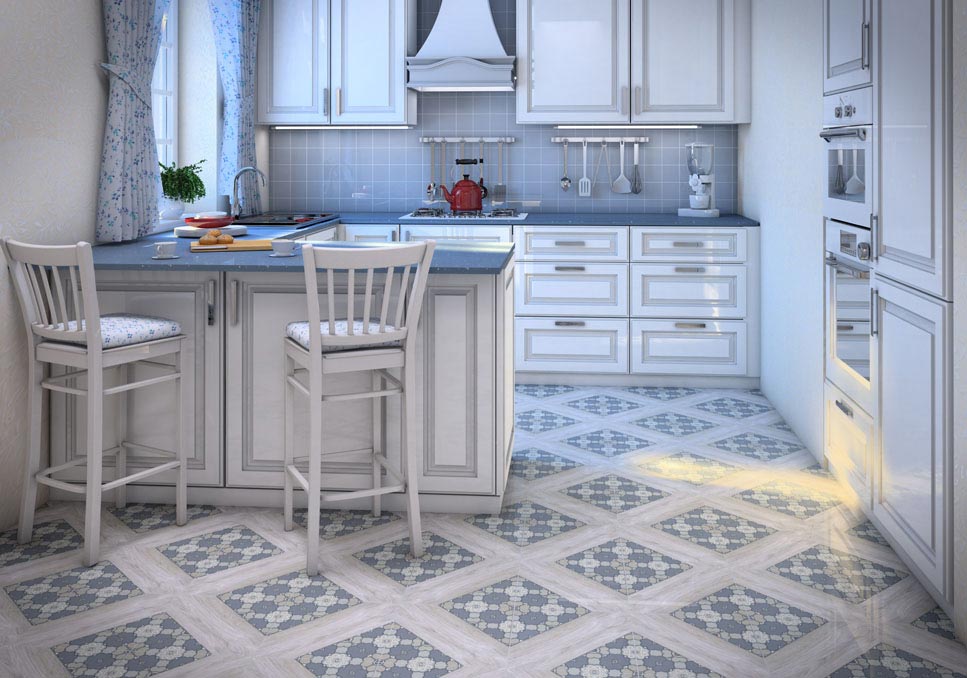 На фото узорчатая плитка квадратной формы на полу в интерьере классической кухни.