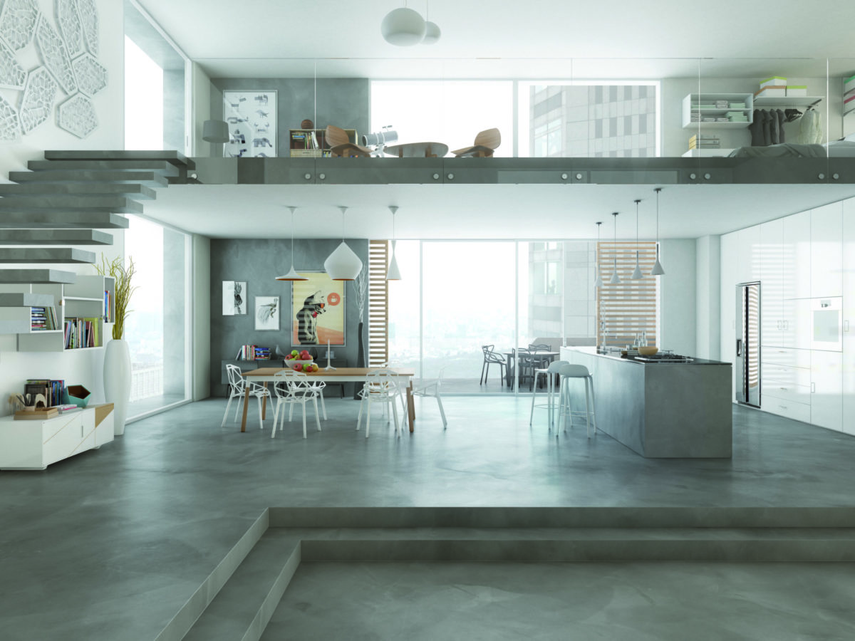 Гораздо выгоднее сделать пол на кухне из бетона. Этот стильный вариант подойдёт не только для Лофта. Если с помощью шлифовальной машинки придать ему блеск, то он вполне дополнит интерьеры всех разновидностей минимализма.