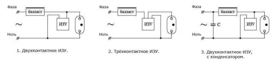 Дроссель включается последовательно с лампочкой, ИЗУ – параллельно. Существует 2 типа ИЗУ – двухвыводной и трехвыводной. Первый более прост в подключении и меньше стоит, второй делает работу схемы более корректной. При использовании трехвыводного ИЗУ в момент пуска высоковольтный разряд подается только на лампу, а не на лампу + балласт, как в случае с двухвыводным устройством. Схема подключения осветителя с использованием обоих типов ИЗУ приведена ниже.