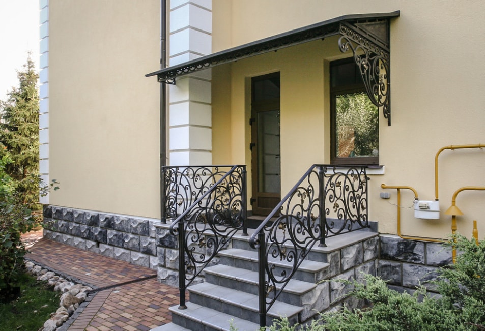 Металл. Металлические каркасы можно изготовить путем ковки. Художественная ковка придает металлическим изделиям удивительную легкость и воздушность. Конечно, вес навеса будет большим. Но эксклюзивные кованые козырьки и навесы над крыльцом имеют презентабельный вид, и целиком оправдывает вложенные усилия. Монтаж такой конструкции требует наличия особо прочных стен.
