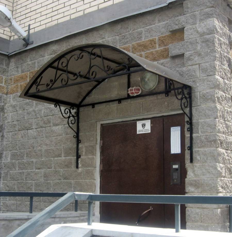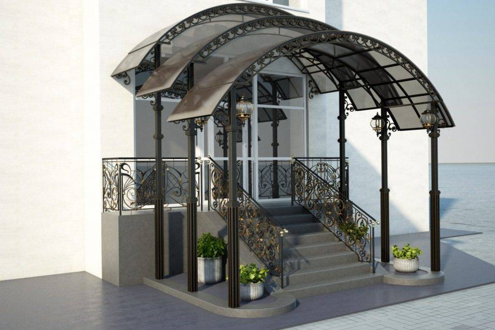 Арочная реализация также имеет свои ограничения по ширине. Чем больше должен быть козырек, тем выше его понадобится монтировать. Козырек в виде полукруга отлично смотрится с любыми зданиями. Благодаря ему можно организовать небольшой коридор, который будет тянуться до самого низа ступенек, если они есть. В этом случае монтируются дополнительные стойки через каждые 1,5 метра. Особой привлекательностью обладают металлические конструкции в виде купола. Они являются своеобразным ответвлением арочных козырьков, но их передняя часть также имеет наклонную плоскость. Купольные варианты могут по ширине быть несколько больше арочного варианта. Вогнутый вариант кованного навеса будет актуален только в том случае, когда его вылет будет не слишком большим.