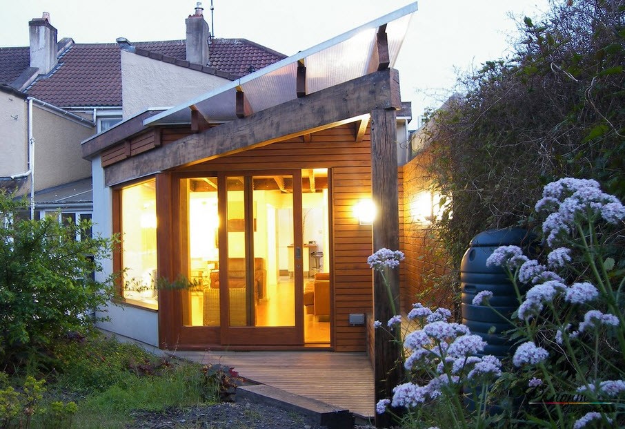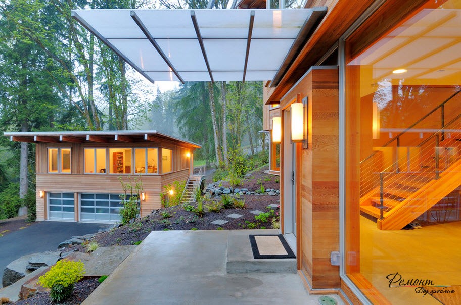 Сама конструкция навеса может быть открытой, либо дополнительно снабжена боковыми, глухими стенками. Большой навес будет уместным при наличии крупного, массивного крыльца, а вот небольшому крылечку подойдет более изящная, невесомая конструкция.