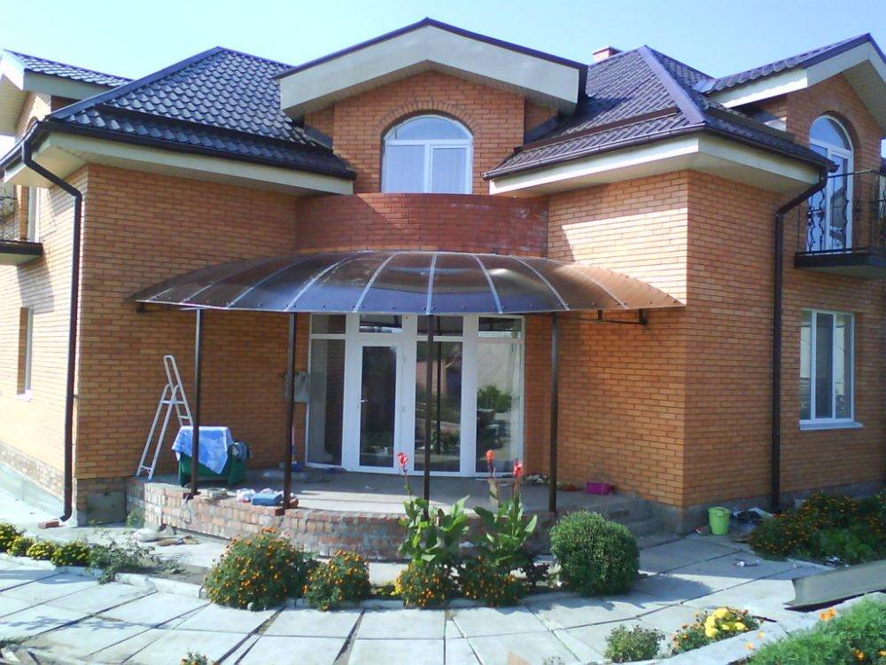 Арочные козырьки над крыльцом сегодня чаще всего устанавливают в частных домах. Сделать козырек над дверью часто решают еще на этапе возведения жилого сооружения. Выполнены такие изделия на базе полукруглого каркаса. Внешне напоминают арку. Являются очень надежными, хорошо защищают от осадков по бокам. В создании и креплении козырьки арочного типа простые. Поэтому обходятся недорого.