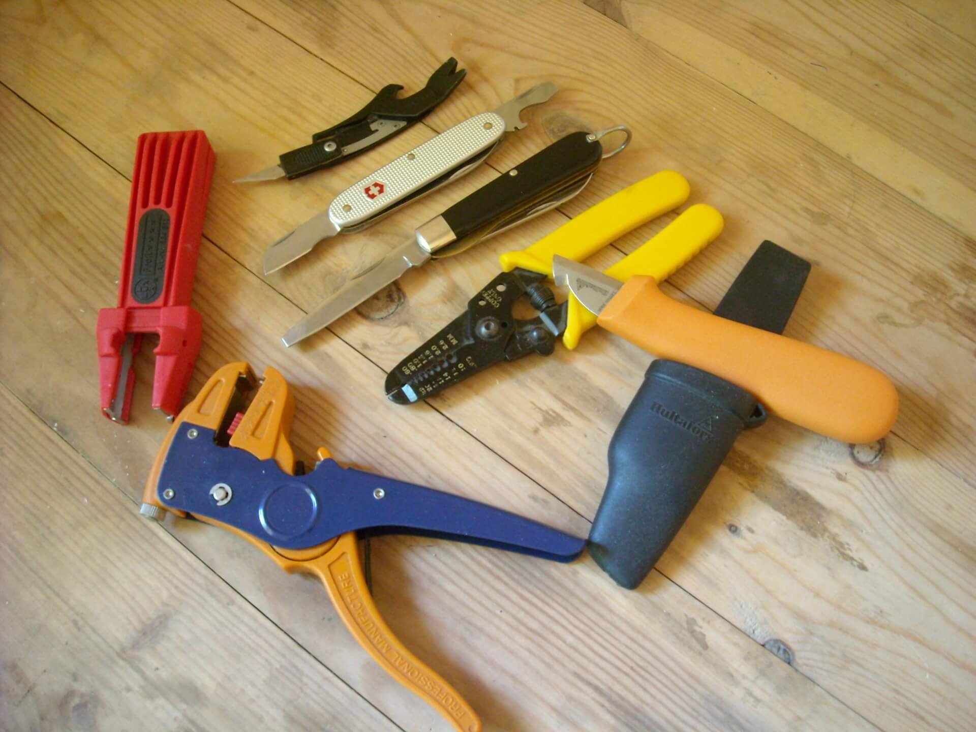 - Монтажный нож. Без этого инструмента сложно представить электромонтажные работы. В собственном ящике с различными приспособлениями у Вас обязательно должен лежать нож и набор лезвий. Тут же сразу же можно добавить, что также не помешает инструмент для снятия изоляции с проводов: специальный нож для электриков либо стриппер.
