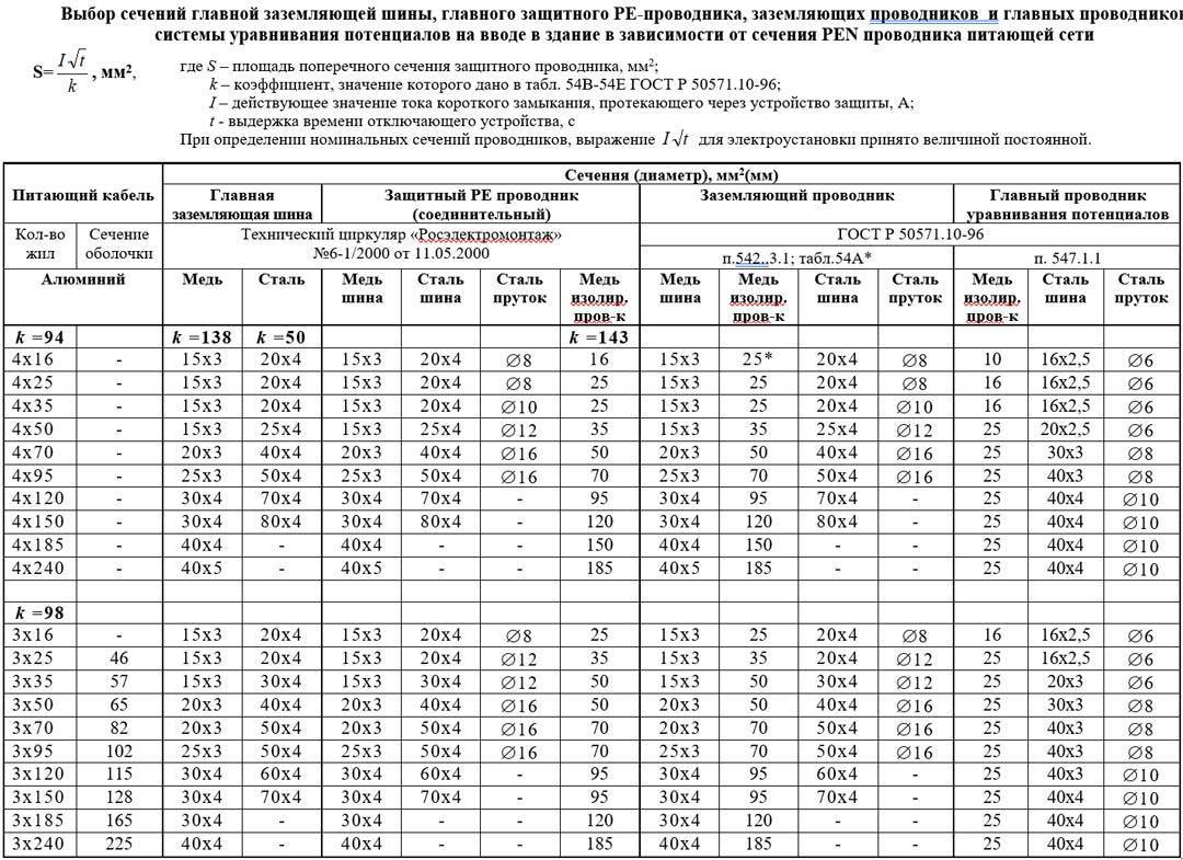 А вот уже готовая таблица для выбора сечения главной заземляющей шины для тех, кто не хочет ничего считать и желает сразу получить готовый результат.