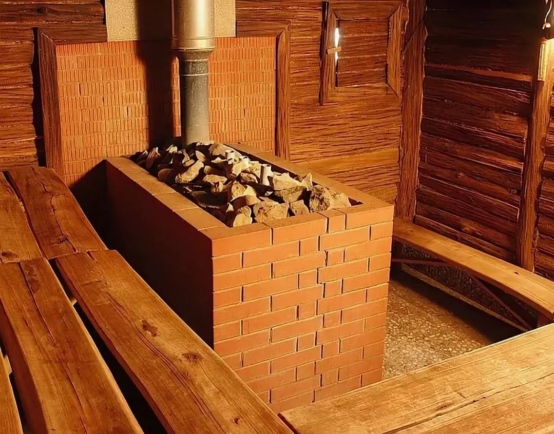 - Обеспечение безопасности при нахождении в парилке. Раскаленный металл представляет определенную опасность: возможность получения случайного ожога при соприкосновении со стенками бака. Обкладка банной печи брусками играет роль барьера, защищающего от сильного жара и внезапного травмирования.