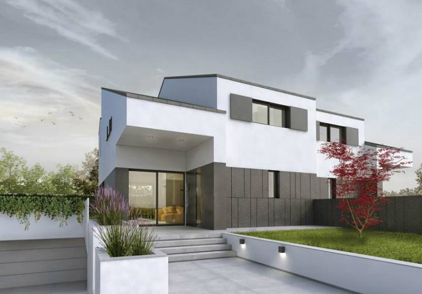 Чтобы создать ощущение легкости в дизайн фасада дома, используйте контрастный цвет. Второй этаж оформить светлыми тонами, а нижний – темными. Интересной деталью экстерьера является сочетание панелей разного размера.