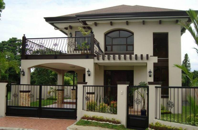 Дизайн фасада двухэтажного дома в колониальном стиле можно гармонично дополнить такими элементами экстерьера, как ажурные заборы и подвесные светильники.