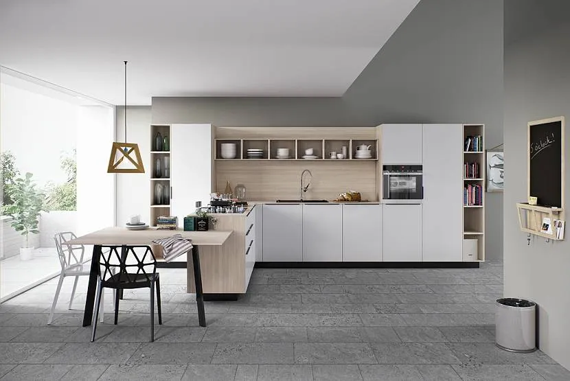Одна часть гарнитура может быть белой, а другая – деревянной, цветной, черной или любой другой. Решение простое, не банальное и может принести много пользы. Например, одну часть шкафов можно оформить в тон стен, чтобы получился эффект невидимости, и пространство казалось менее загроможденным.