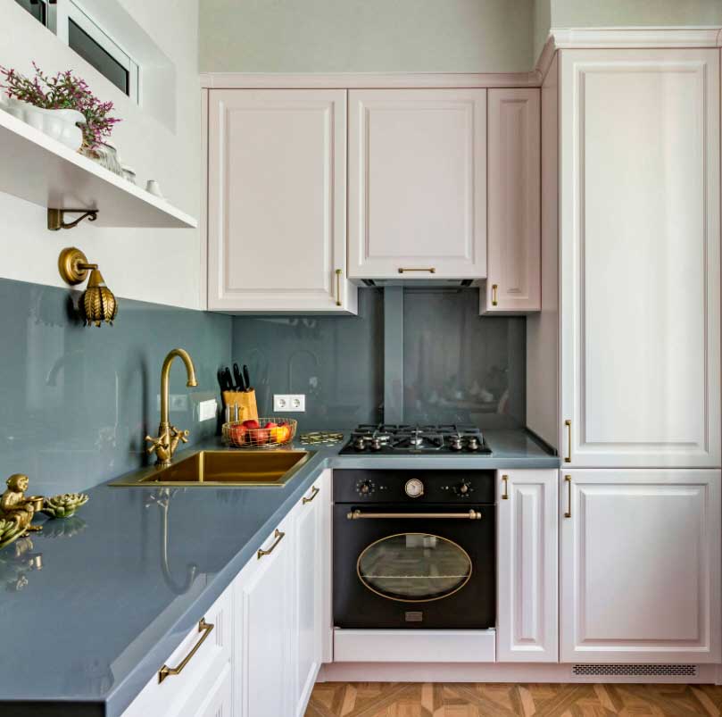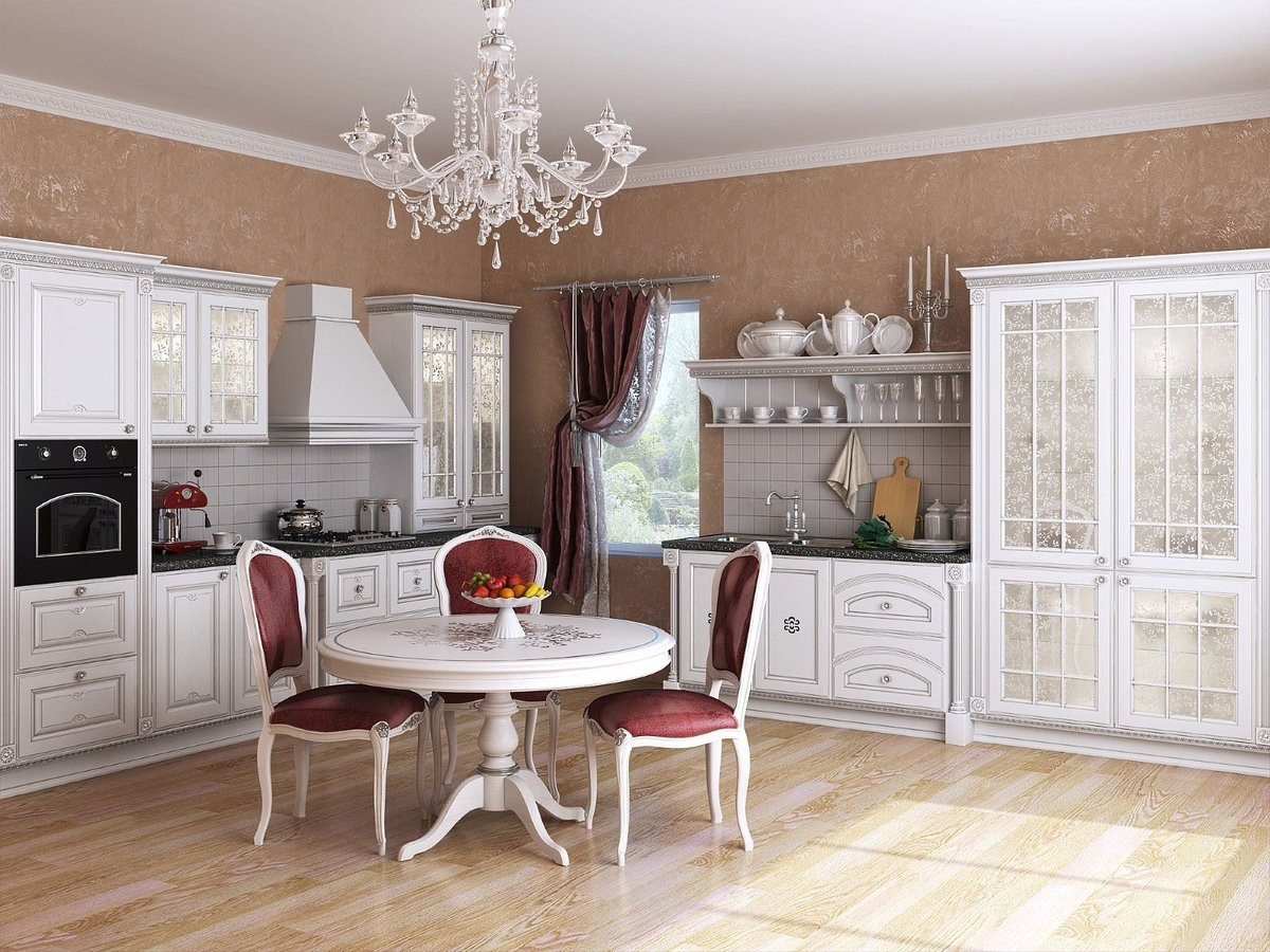 Если классические кухни белые, они смотрятся не столь нарядно и перегружено, что будет плюсом в малогабаритном помещении. В условиях недостатка пространства более уместным будет неоклассический дизайн.