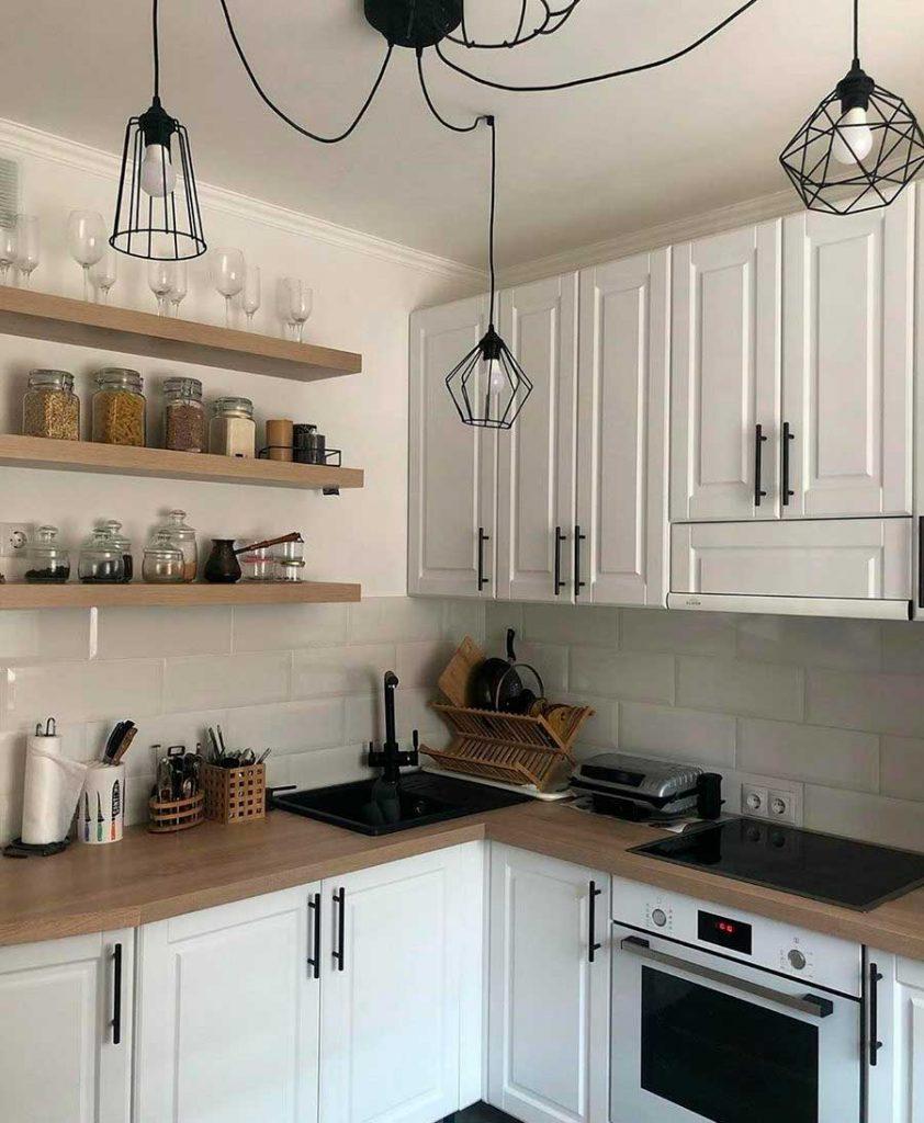 Белая кухня с черными акцентами – самая эффектная. Особенно, если она оформлена в парижском стиле, в стиле ар-деко, минимализм или хай-тек. Вот отличный пример интерьера в парижском стиле – белая кухня с черной столешницей из искусственного камня, темным светильником и вставками в отделке пола. Площадь этой кухоньки в перепланированной хрущевке составляет всего 5 кв. метров.