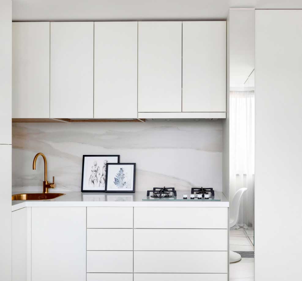 - Если кухня белая, в её дизайн легко внести новые штрихи такими несложными способами, как монтаж нового фартука или смена декора.