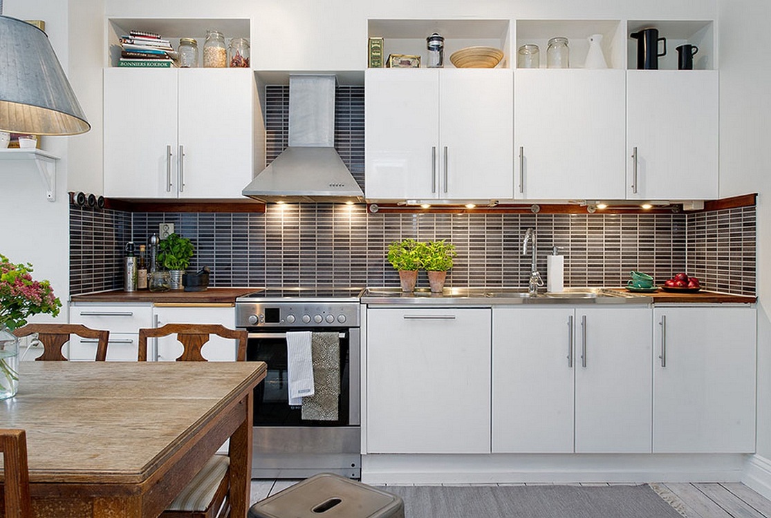 Поэтому, если у вас маленькая кухня, в белом цвете ее обязательно стоит оформить. При этом идеальное распределение его по всем четырем стенам.