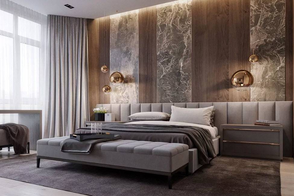 - Серый цвет – оптимальное решение для спальни, оформленной в современном стиле.