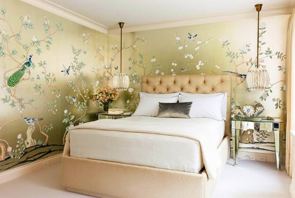 Светлые обои, используемые для формирования фона в спальной комнате, могут иметь небольшие растительные и цветочные принты.
