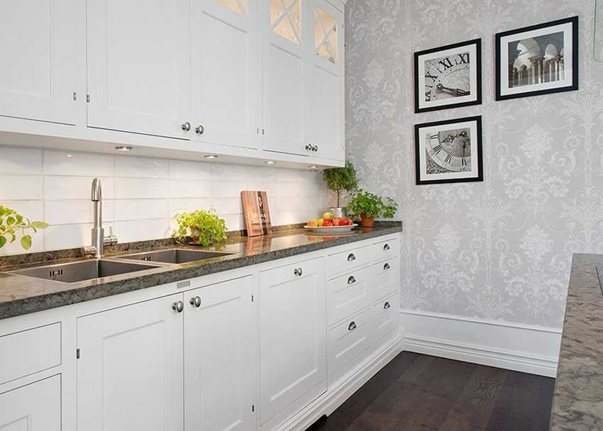 К нестандартным, но уже довольно популярным вариантам кухонной отделки в стиле классики можно отнести обои с имитирующими свойствами. Поскольку такие материалы обладают повышенной прочностью и износостойкостью, их рекомендуется использовать для создания фартука в рабочей зоне кухни.