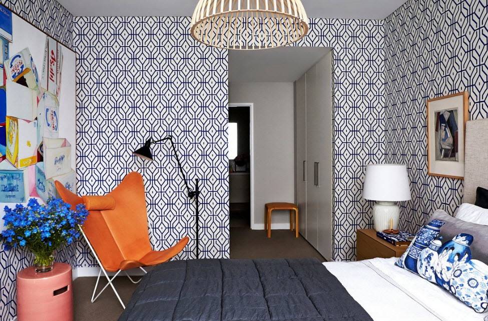 При отделке стен в спальной комнате обои клеят под изломанными углами. Это позволяет создать эксклюзивный интерьер, демонстрирующий изысканный вкус хозяина жилья. Сочетать можно сложные геометрические формы и линии, выделяющиеся ярким цветом или резким переходом оттенков одного цвета.