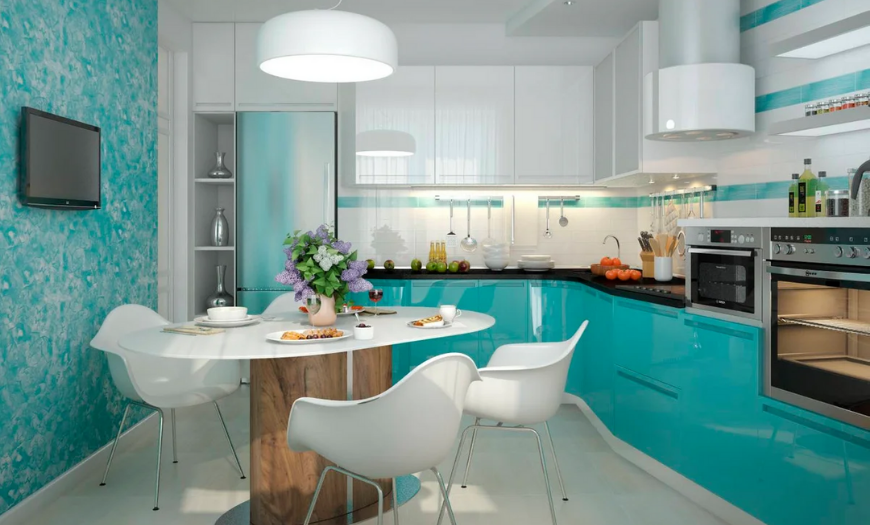 Совет: если вам не повезло с планировкой кухни – исправьте ее форму, используя обои более ярких цветов. К примеру, в узких кухнях длинные стены оформляются в синих, коричневых, бордовых и других тонах: такая палитра приближает и расширяет отдельные зоны комнаты.