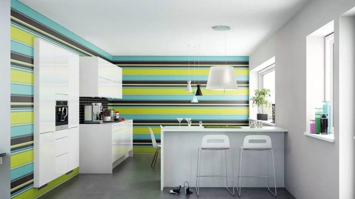Внимание! Если вы предпочли оформлять кухню в современном стиле с использованием обоев на геометрическую, абстрактную или 3-D-тематику – повторите яркие оттенки в текстиле и аксессуарах. Из удачных вариантов узорчатого оформления стен наибольшей популярностью пользуются обои в полоску