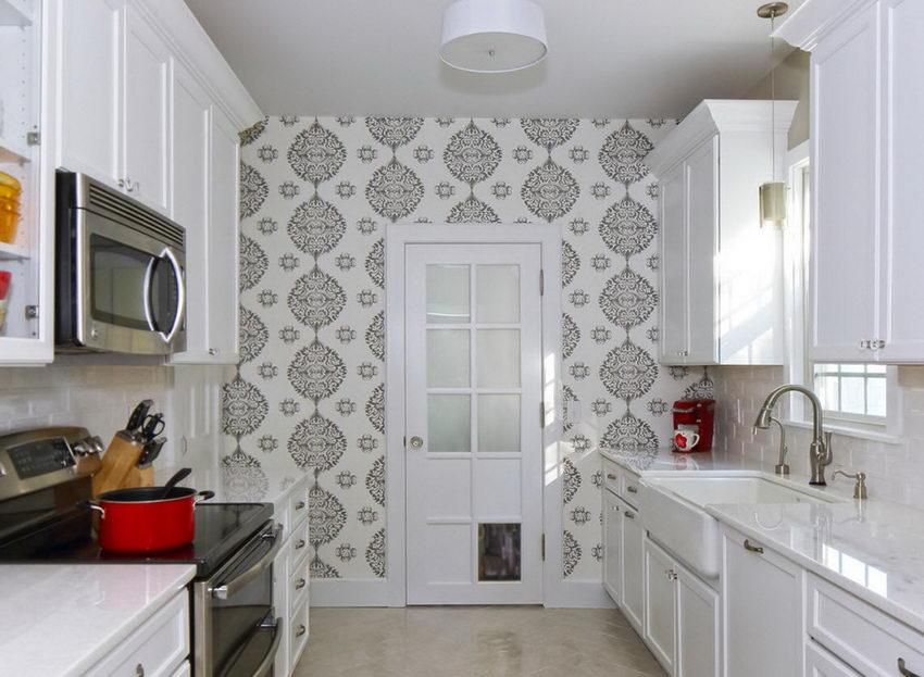 Узорчатые обои довольно часто включают и светлые, и яркие оттенки. Поэтому особенности их использования в дизайне тесной кухни будут зависеть от самого характера рисунка.