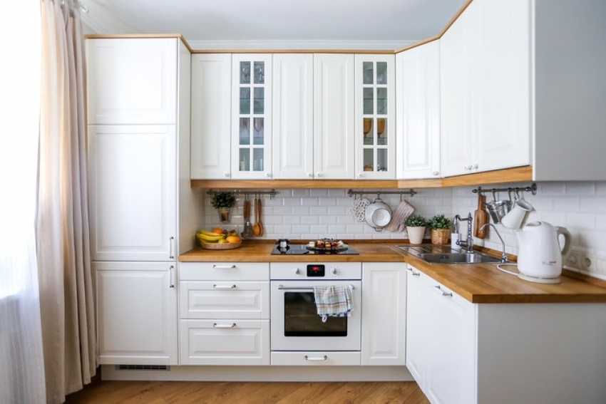Г-образный гарнитур, располагаемый вдоль двух смежных стен. Угол также задействован – в нем обычно оборудуют мойку. А две рабочие поверхности отнюдь не будут лишними.